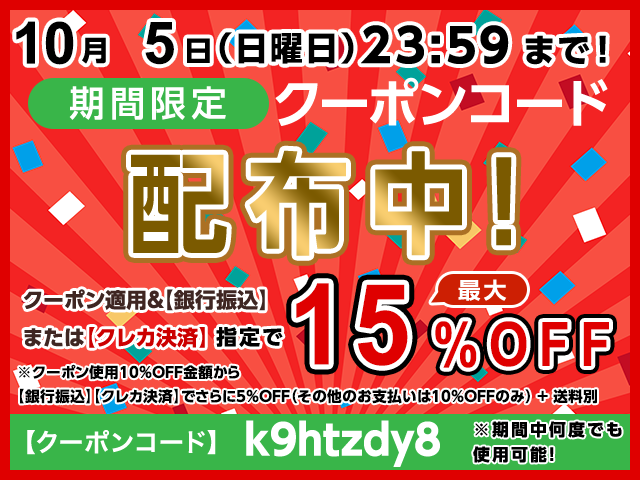10/5(日)23:59 まで期間限定!期間中は当店で何度でも使用可能な10%OFFのクーポンコードを配布いたします♪