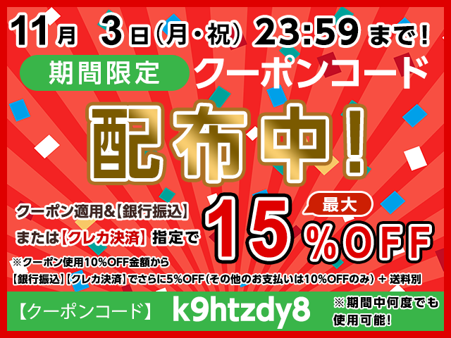 11/3(月・祝)23:59 まで期間限定!期間中は当店で何度でも使用可能な10%OFFのクーポンコードを配布いたします♪